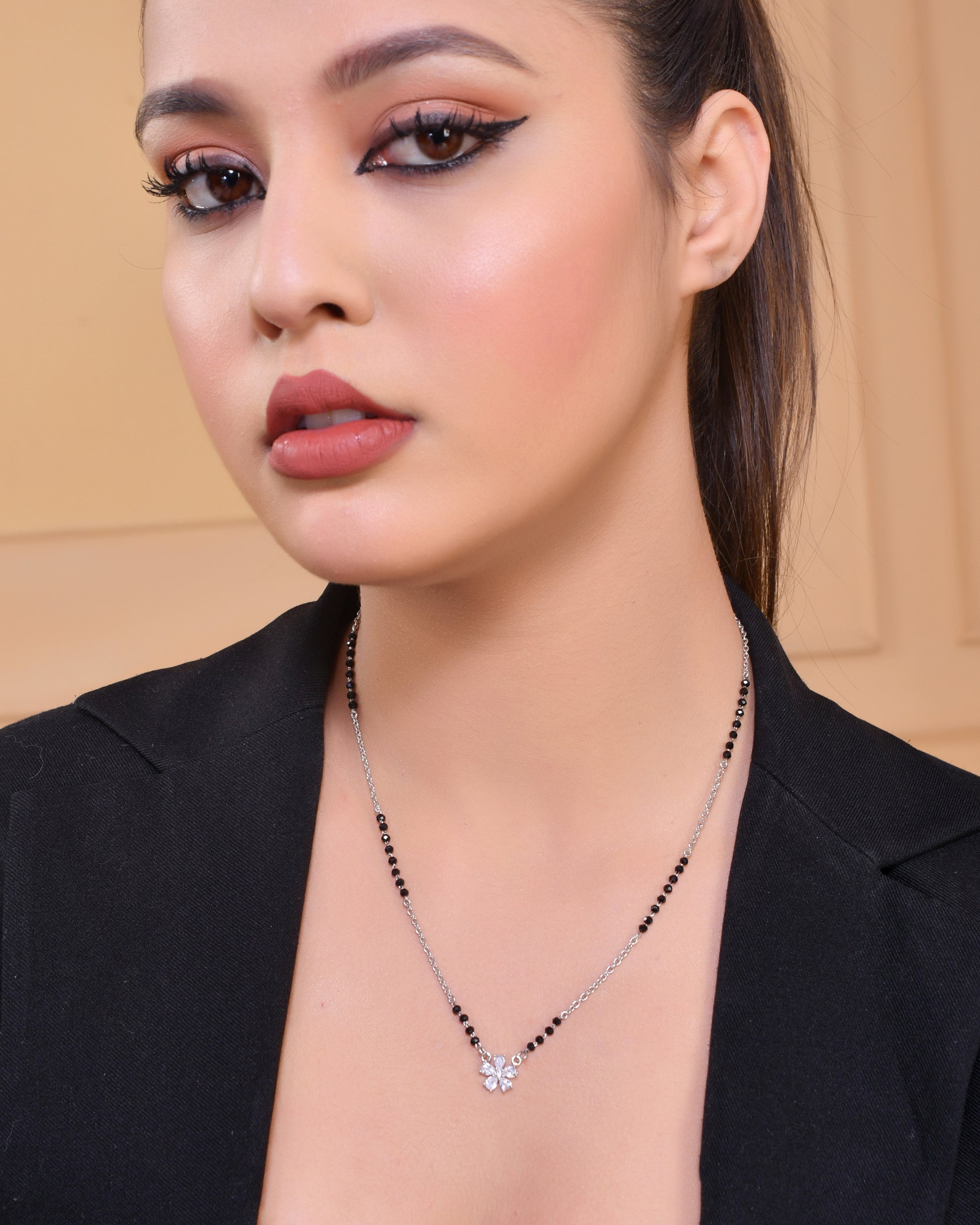 925 Sterling Silver Diamond Flower Charm Mangalsutra Pendant Chain for Women
