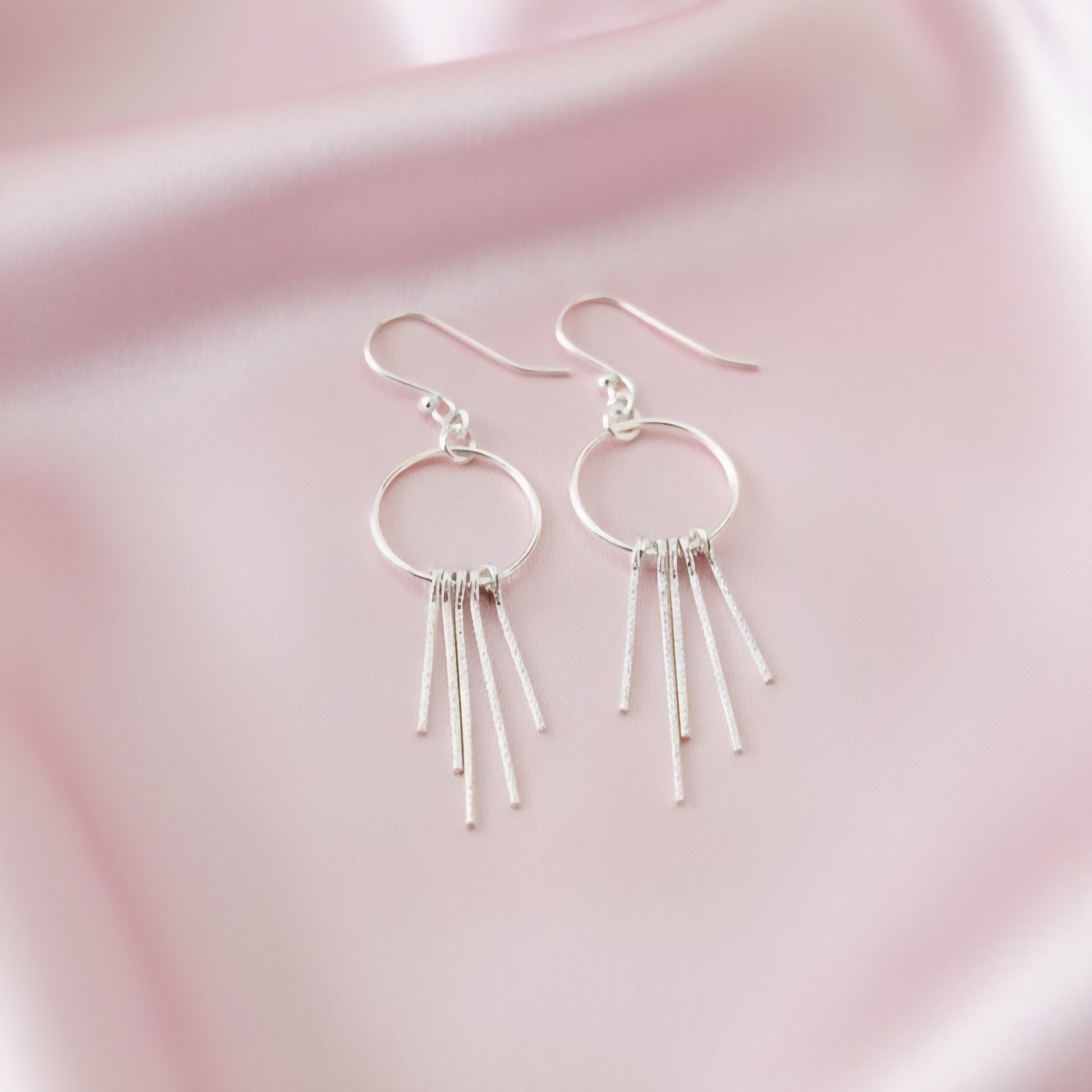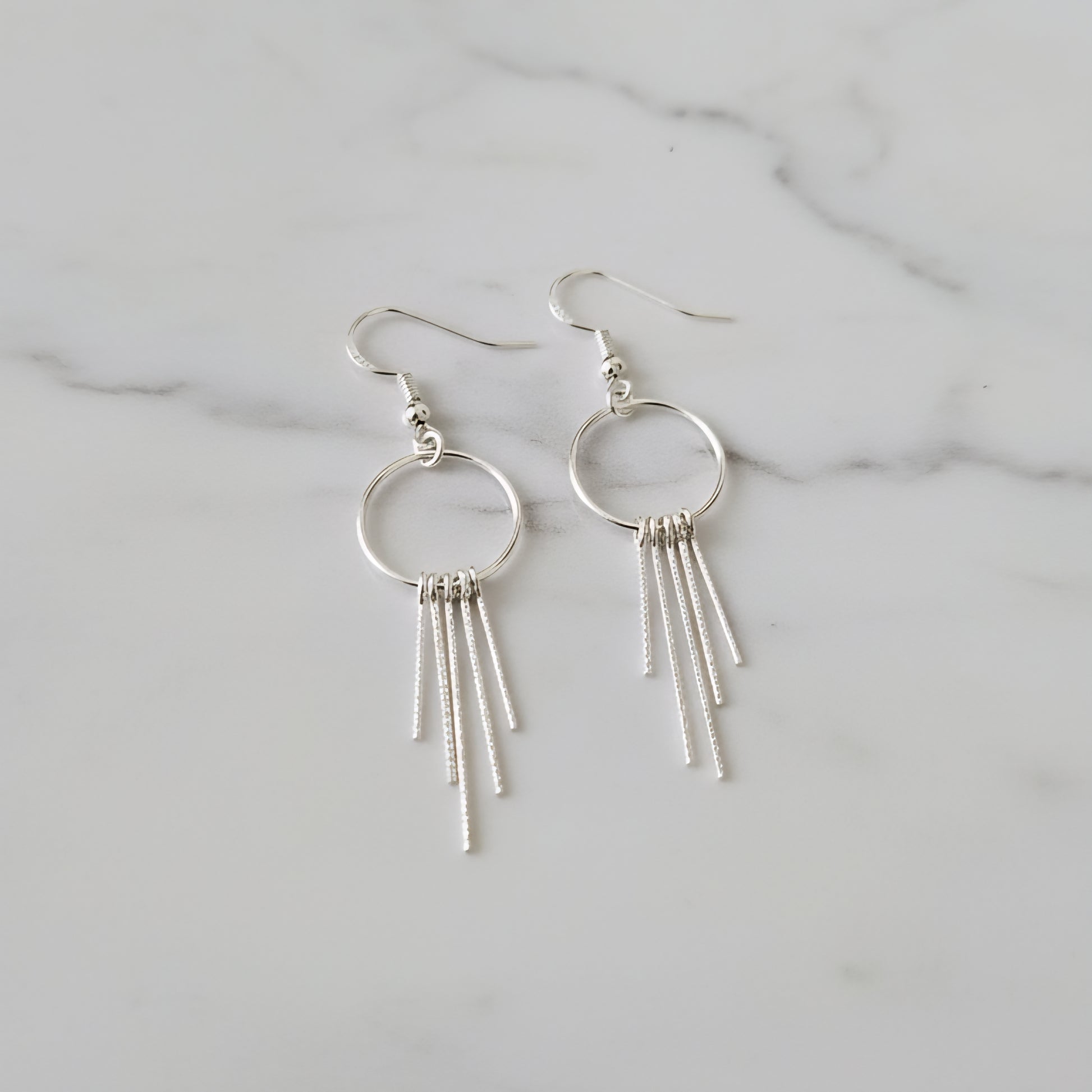 These Textured Sterling Silver Circle Fringe Earrings blend modern minimalism with a touch of bohemian charm.