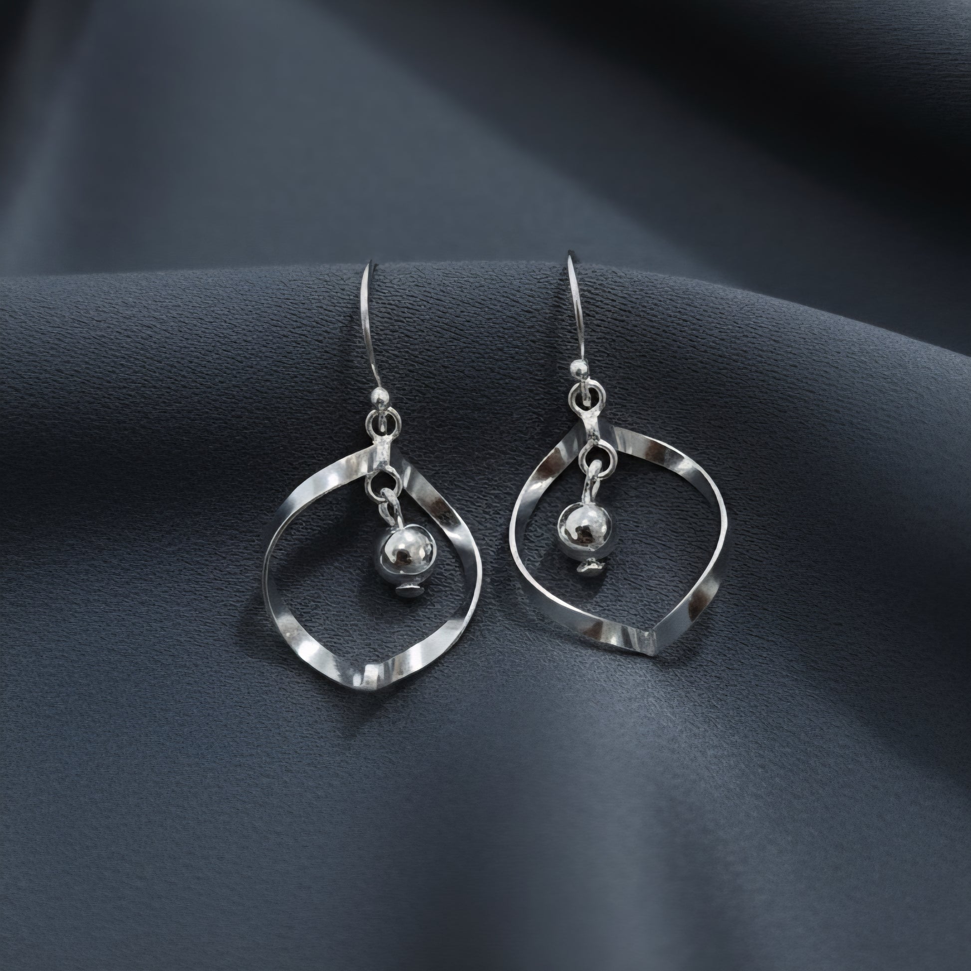 Each piece is handcrafted with precision, featuring a delicate twisted silver loop that frames a polished silver bead, creating graceful movement and shimmer.